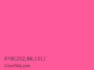RYB 252,88,151 Color is a light rose color and the nearest color is Violet Red #f75394. Hex code #fc5897 and RGB value is rgb(252,88,151). In RGB color space, this color is composed of 99% red, 35% green, 59% blue, In CMYK color space, this color is composed of 0% cyan, 65% magenta, 40% yellow , 1% black , In HSL color space, this color has a hue angle of 337° , 96% saturation and 67% lightness.