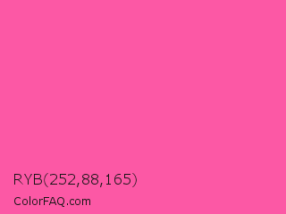 RYB 252,88,165 Color is a light rose color and the nearest color is Brilliant Rose #ff55a3. Hex code #fc58a5 and RGB value is rgb(252,88,165). In RGB color space, this color is composed of 99% red, 35% green, 65% blue, In CMYK color space, this color is composed of 0% cyan, 65% magenta, 35% yellow , 1% black , In HSL color space, this color has a hue angle of 332° , 96% saturation and 67% lightness.