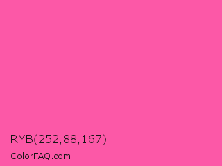 RYB 252,88,167 Color is a light rose color and the nearest color is Brilliant Rose #ff55a3. Hex code #fc58a7 and RGB value is rgb(252,88,167). In RGB color space, this color is composed of 99% red, 35% green, 65% blue, In CMYK color space, this color is composed of 0% cyan, 65% magenta, 34% yellow , 1% black , In HSL color space, this color has a hue angle of 331° , 96% saturation and 67% lightness.