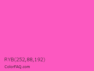 RYB 252,88,192 Color is a light magenta color and the nearest color is Light Deep Pink #ff5ccd. Hex code #fc58c0 and RGB value is rgb(252,88,192). In RGB color space, this color is composed of 99% red, 35% green, 75% blue, In CMYK color space, this color is composed of 0% cyan, 65% magenta, 24% yellow , 1% black , In HSL color space, this color has a hue angle of 322° , 96% saturation and 67% lightness.