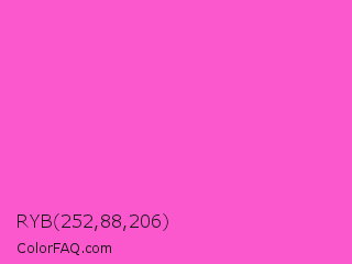 RYB 252,88,206 Color is a light magenta color and the nearest color is Light Deep Pink #ff5ccd. Hex code #fc58ce and RGB value is rgb(252,88,206). In RGB color space, this color is composed of 99% red, 35% green, 81% blue, In CMYK color space, this color is composed of 0% cyan, 65% magenta, 18% yellow , 1% black , In HSL color space, this color has a hue angle of 317° , 96% saturation and 67% lightness.