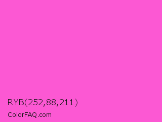RYB 252,88,211 Color is a light magenta color and the nearest color is Light Deep Pink #ff5ccd. Hex code #fc58d3 and RGB value is rgb(252,88,211). In RGB color space, this color is composed of 99% red, 35% green, 83% blue, In CMYK color space, this color is composed of 0% cyan, 65% magenta, 16% yellow , 1% black , In HSL color space, this color has a hue angle of 315° , 96% saturation and 67% lightness.