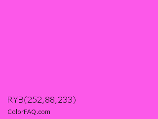 RYB 252,88,233 Color is a light magenta color and the nearest color is Purple Pizzazz #fe4eda. Hex code #fc58e9 and RGB value is rgb(252,88,233). In RGB color space, this color is composed of 99% red, 35% green, 91% blue, In CMYK color space, this color is composed of 0% cyan, 65% magenta, 8% yellow , 1% black , In HSL color space, this color has a hue angle of 307° , 96% saturation and 67% lightness.