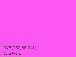 RYB 252,88,241 Color is a light magenta color and the nearest color is Pink Flamingo Crayola #ff66ff. Hex code #fc58f1 and RGB value is rgb(252,88,241). In RGB color space, this color is composed of 99% red, 35% green, 95% blue, In CMYK color space, this color is composed of 0% cyan, 65% magenta, 4% yellow , 1% black , In HSL color space, this color has a hue angle of 304° , 96% saturation and 67% lightness.