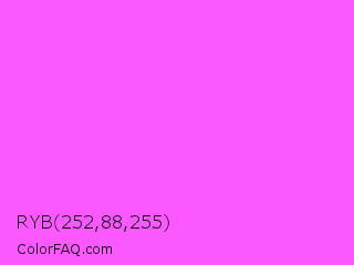RYB 252,88,255 Color is a light magenta color and the nearest color is Pink Flamingo Crayola #ff66ff. Hex code #fc58ff and RGB value is rgb(252,88,255). In RGB color space, this color is composed of 99% red, 35% green, 100% blue, In CMYK color space, this color is composed of 1% cyan, 65% magenta, 0% yellow , 0% black , In HSL color space, this color has a hue angle of 299° , 100% saturation and 67% lightness.