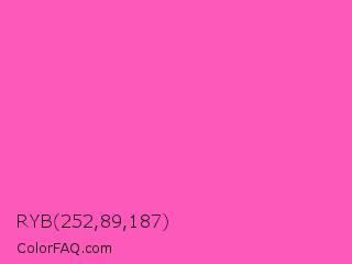 RYB 252,89,187 Color is a light magenta color and the nearest color is Hot Pink #ff69b4. Hex code #fc59bb and RGB value is rgb(252,89,187). In RGB color space, this color is composed of 99% red, 35% green, 73% blue, In CMYK color space, this color is composed of 0% cyan, 65% magenta, 26% yellow , 1% black , In HSL color space, this color has a hue angle of 324° , 96% saturation and 67% lightness.