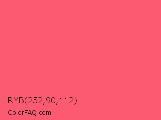 RYB 252,90,112 Color is a light red color and the nearest color is Fiery Rose #ff5470. Hex code #fc5a70 and RGB value is rgb(252,90,112). In RGB color space, this color is composed of 99% red, 35% green, 44% blue, In CMYK color space, this color is composed of 0% cyan, 64% magenta, 56% yellow , 1% black , In HSL color space, this color has a hue angle of 352° , 96% saturation and 67% lightness.