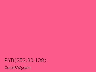 RYB 252,90,138 Color is a light rose color and the nearest color is Strawberry #fc5a8d. Hex code #fc5a8a and RGB value is rgb(252,90,138). In RGB color space, this color is composed of 99% red, 35% green, 54% blue, In CMYK color space, this color is composed of 0% cyan, 64% magenta, 45% yellow , 1% black , In HSL color space, this color has a hue angle of 342° , 96% saturation and 67% lightness.