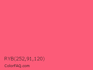 RYB 252,91,120 Color is a light red color and the nearest color is Wild Watermelon #fd5b78. Hex code #fc5b78 and RGB value is rgb(252,91,120). In RGB color space, this color is composed of 99% red, 36% green, 47% blue, In CMYK color space, this color is composed of 0% cyan, 64% magenta, 52% yellow , 1% black , In HSL color space, this color has a hue angle of 349° , 96% saturation and 67% lightness.