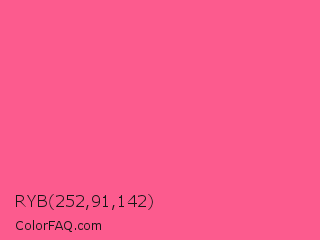 RYB 252,91,142 Color is a light rose color and the nearest color is Strawberry #fc5a8d. Hex code #fc5b8e and RGB value is rgb(252,91,142). In RGB color space, this color is composed of 99% red, 36% green, 56% blue, In CMYK color space, this color is composed of 0% cyan, 64% magenta, 44% yellow , 1% black , In HSL color space, this color has a hue angle of 341° , 96% saturation and 67% lightness.
