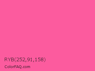 RYB 252,91,158 Color is a light rose color and the nearest color is Brilliant Rose #ff55a3. Hex code #fc5b9e and RGB value is rgb(252,91,158). In RGB color space, this color is composed of 99% red, 36% green, 62% blue, In CMYK color space, this color is composed of 0% cyan, 64% magenta, 37% yellow , 1% black , In HSL color space, this color has a hue angle of 335° , 96% saturation and 67% lightness.