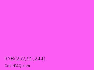 RYB 252,91,244 Color is a light magenta color and the nearest color is Pink Flamingo Crayola #ff66ff. Hex code #fc5bf4 and RGB value is rgb(252,91,244). In RGB color space, this color is composed of 99% red, 36% green, 96% blue, In CMYK color space, this color is composed of 0% cyan, 64% magenta, 3% yellow , 1% black , In HSL color space, this color has a hue angle of 303° , 96% saturation and 67% lightness.