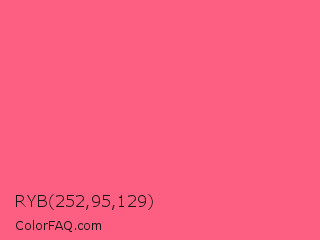 RYB 252,95,129 Color is a light red color and the nearest color is Brink Pink #fb607f. Hex code #fc5f81 and RGB value is rgb(252,95,129). In RGB color space, this color is composed of 99% red, 37% green, 51% blue, In CMYK color space, this color is composed of 0% cyan, 62% magenta, 49% yellow , 1% black , In HSL color space, this color has a hue angle of 347° , 96% saturation and 68% lightness.
