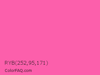 RYB 252,95,171 Color is a light rose color and the nearest color is Brilliant Rose #ff55a3. Hex code #fc5fab and RGB value is rgb(252,95,171). In RGB color space, this color is composed of 99% red, 37% green, 67% blue, In CMYK color space, this color is composed of 0% cyan, 62% magenta, 32% yellow , 1% black , In HSL color space, this color has a hue angle of 331° , 96% saturation and 68% lightness.