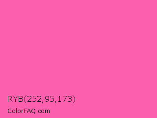 RYB 252,95,173 Color is a light rose color and the nearest color is Hot Pink #ff69b4. Hex code #fc5fad and RGB value is rgb(252,95,173). In RGB color space, this color is composed of 99% red, 37% green, 68% blue, In CMYK color space, this color is composed of 0% cyan, 62% magenta, 31% yellow , 1% black , In HSL color space, this color has a hue angle of 330° , 96% saturation and 68% lightness.