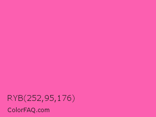 RYB 252,95,176 Color is a light rose color and the nearest color is Hot Pink #ff69b4. Hex code #fc5fb0 and RGB value is rgb(252,95,176). In RGB color space, this color is composed of 99% red, 37% green, 69% blue, In CMYK color space, this color is composed of 0% cyan, 62% magenta, 30% yellow , 1% black , In HSL color space, this color has a hue angle of 329° , 96% saturation and 68% lightness.