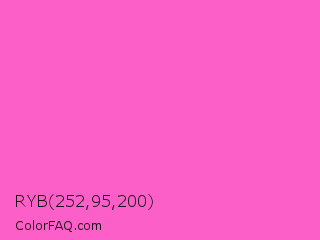 RYB 252,95,200 Color is a light magenta color and the nearest color is Light Deep Pink #ff5ccd. Hex code #fc5fc8 and RGB value is rgb(252,95,200). In RGB color space, this color is composed of 99% red, 37% green, 78% blue, In CMYK color space, this color is composed of 0% cyan, 62% magenta, 21% yellow , 1% black , In HSL color space, this color has a hue angle of 320° , 96% saturation and 68% lightness.