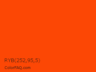 RYB 252,95,5 Color is a normal orange color and the nearest color is Orange Red #ff4500. Hex code #fc4705 and RGB value is rgb(252,71,5). In RGB color space, this color is composed of 99% red, 28% green, 2% blue, In CMYK color space, this color is composed of 0% cyan, 72% magenta, 98% yellow , 1% black , In HSL color space, this color has a hue angle of 16° , 98% saturation and 50% lightness.