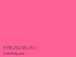 RYB 252,96,151 Color is a light rose color and the nearest color is Strawberry #fc5a8d. Hex code #fc6097 and RGB value is rgb(252,96,151). In RGB color space, this color is composed of 99% red, 38% green, 59% blue, In CMYK color space, this color is composed of 0% cyan, 62% magenta, 40% yellow , 1% black , In HSL color space, this color has a hue angle of 339° , 96% saturation and 68% lightness.