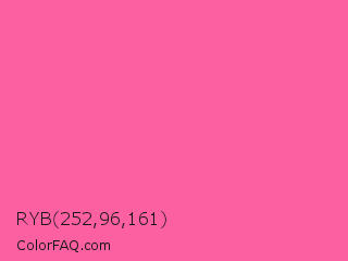 RYB 252,96,161 Color is a light rose color and the nearest color is Brilliant Rose #ff55a3. Hex code #fc60a1 and RGB value is rgb(252,96,161). In RGB color space, this color is composed of 99% red, 38% green, 63% blue, In CMYK color space, this color is composed of 0% cyan, 62% magenta, 36% yellow , 1% black , In HSL color space, this color has a hue angle of 335° , 96% saturation and 68% lightness.
