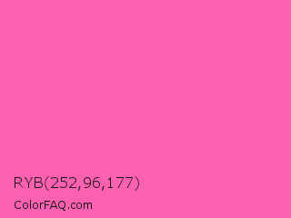 RYB 252,96,177 Color is a light rose color and the nearest color is Hot Pink #ff69b4. Hex code #fc60b1 and RGB value is rgb(252,96,177). In RGB color space, this color is composed of 99% red, 38% green, 69% blue, In CMYK color space, this color is composed of 0% cyan, 62% magenta, 30% yellow , 1% black , In HSL color space, this color has a hue angle of 329° , 96% saturation and 68% lightness.