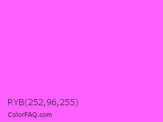 RYB 252,96,255 Color is a light magenta color and the nearest color is Pink Flamingo Crayola #ff66ff. Hex code #fc60ff and RGB value is rgb(252,96,255). In RGB color space, this color is composed of 99% red, 38% green, 100% blue, In CMYK color space, this color is composed of 1% cyan, 62% magenta, 0% yellow , 0% black , In HSL color space, this color has a hue angle of 299° , 100% saturation and 69% lightness.