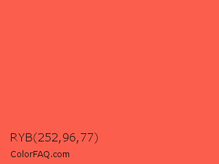 RYB 252,96,77 Color is a light red color and the nearest color is Sunset Orange #fd5e53. Hex code #fc5e4d and RGB value is rgb(252,94,77). In RGB color space, this color is composed of 99% red, 37% green, 30% blue, In CMYK color space, this color is composed of 0% cyan, 63% magenta, 69% yellow , 1% black , In HSL color space, this color has a hue angle of 6° , 97% saturation and 65% lightness.