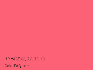 RYB 252,97,117 Color is a light red color and the nearest color is Wild Watermelon #fd5b78. Hex code #fc6175 and RGB value is rgb(252,97,117). In RGB color space, this color is composed of 99% red, 38% green, 46% blue, In CMYK color space, this color is composed of 0% cyan, 62% magenta, 54% yellow , 1% black , In HSL color space, this color has a hue angle of 352° , 96% saturation and 68% lightness.