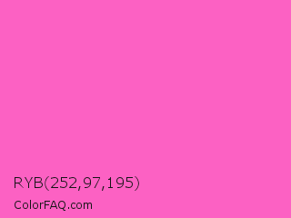 RYB 252,97,195 Color is a light magenta color and the nearest color is Rose Pink #ff66cc. Hex code #fc61c3 and RGB value is rgb(252,97,195). In RGB color space, this color is composed of 99% red, 38% green, 76% blue, In CMYK color space, this color is composed of 0% cyan, 62% magenta, 23% yellow , 1% black , In HSL color space, this color has a hue angle of 322° , 96% saturation and 68% lightness.