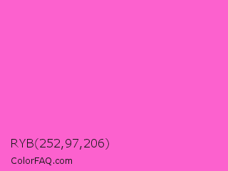 RYB 252,97,206 Color is a light magenta color and the nearest color is Light Deep Pink #ff5ccd. Hex code #fc61ce and RGB value is rgb(252,97,206). In RGB color space, this color is composed of 99% red, 38% green, 81% blue, In CMYK color space, this color is composed of 0% cyan, 62% magenta, 18% yellow , 1% black , In HSL color space, this color has a hue angle of 318° , 96% saturation and 68% lightness.