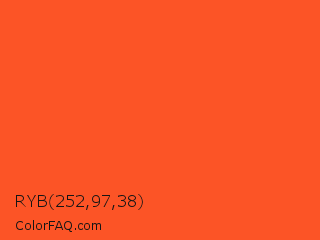 RYB 252,97,38 Color is a normal red color and the nearest color is Flamingo #f2552a. Hex code #fc5426 and RGB value is rgb(252,84,38). In RGB color space, this color is composed of 99% red, 33% green, 15% blue, In CMYK color space, this color is composed of 0% cyan, 67% magenta, 85% yellow , 1% black , In HSL color space, this color has a hue angle of 13° , 97% saturation and 57% lightness.