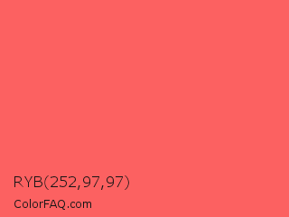 RYB 252,97,97 Color is a light red color and the nearest color is Carnation #f95a61. Hex code #fc6161 and RGB value is rgb(252,97,97). In RGB color space, this color is composed of 99% red, 38% green, 38% blue, In CMYK color space, this color is composed of 0% cyan, 62% magenta, 62% yellow , 1% black , In HSL color space, this color has a hue angle of 0° , 96% saturation and 68% lightness.