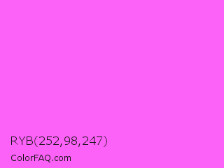 RYB 252,98,247 Color is a light magenta color and the nearest color is Pink Flamingo Crayola #ff66ff. Hex code #fc62f7 and RGB value is rgb(252,98,247). In RGB color space, this color is composed of 99% red, 38% green, 97% blue, In CMYK color space, this color is composed of 0% cyan, 61% magenta, 2% yellow , 1% black , In HSL color space, this color has a hue angle of 302° , 96% saturation and 69% lightness.