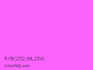 RYB 252,98,254 Color is a light magenta color and the nearest color is Pink Flamingo Crayola #ff66ff. Hex code #fc62fe and RGB value is rgb(252,98,254). In RGB color space, this color is composed of 99% red, 38% green, 100% blue, In CMYK color space, this color is composed of 1% cyan, 61% magenta, 0% yellow , 0% black , In HSL color space, this color has a hue angle of 299° , 99% saturation and 69% lightness.