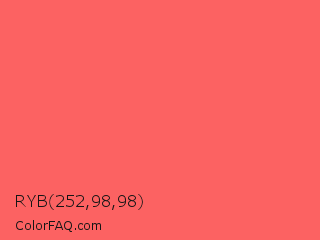 RYB 252,98,98 Color is a light red color and the nearest color is Pastel Red #ff6961. Hex code #fc6262 and RGB value is rgb(252,98,98). In RGB color space, this color is composed of 99% red, 38% green, 38% blue, In CMYK color space, this color is composed of 0% cyan, 61% magenta, 61% yellow , 1% black , In HSL color space, this color has a hue angle of 0° , 96% saturation and 69% lightness.