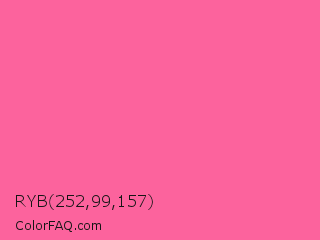 RYB 252,99,157 Color is a light rose color and the nearest color is French Pink #fd6c9e. Hex code #fc639d and RGB value is rgb(252,99,157). In RGB color space, this color is composed of 99% red, 39% green, 62% blue, In CMYK color space, this color is composed of 0% cyan, 61% magenta, 38% yellow , 1% black , In HSL color space, this color has a hue angle of 337° , 96% saturation and 69% lightness.
