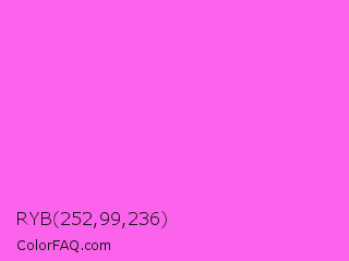 RYB 252,99,236 Color is a light magenta color and the nearest color is Pink Flamingo Crayola #ff66ff. Hex code #fc63ec and RGB value is rgb(252,99,236). In RGB color space, this color is composed of 99% red, 39% green, 93% blue, In CMYK color space, this color is composed of 0% cyan, 61% magenta, 6% yellow , 1% black , In HSL color space, this color has a hue angle of 306° , 96% saturation and 69% lightness.
