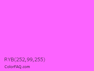 RYB 252,99,255 Color is a light magenta color and the nearest color is Pink Flamingo Crayola #ff66ff. Hex code #fc63ff and RGB value is rgb(252,99,255). In RGB color space, this color is composed of 99% red, 39% green, 100% blue, In CMYK color space, this color is composed of 1% cyan, 61% magenta, 0% yellow , 0% black , In HSL color space, this color has a hue angle of 299° , 100% saturation and 69% lightness.