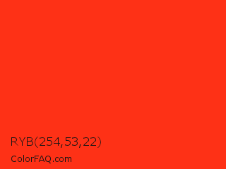RYB 254,53,22 Color is a normal red color and the nearest color is Red RYB #fe2712. Hex code #fe3116 and RGB value is rgb(254,49,22). In RGB color space, this color is composed of 100% red, 19% green, 9% blue, In CMYK color space, this color is composed of 0% cyan, 81% magenta, 91% yellow , 0% black , In HSL color space, this color has a hue angle of 7° , 99% saturation and 54% lightness.