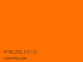 RYB 255,197,2 Color is a normal orange color and the nearest color is Safety Orange #ff7800. Hex code #ff7002 and RGB value is rgb(255,112,2). In RGB color space, this color is composed of 100% red, 44% green, 1% blue, In CMYK color space, this color is composed of 0% cyan, 56% magenta, 99% yellow , 0% black , In HSL color space, this color has a hue angle of 26° , 100% saturation and 50% lightness.