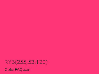 RYB 255,53,120 Color is a normal rose color and the nearest color is Sasquatch Socks #ff4681. Hex code #ff3578 and RGB value is rgb(255,53,120). In RGB color space, this color is composed of 100% red, 21% green, 47% blue, In CMYK color space, this color is composed of 0% cyan, 79% magenta, 53% yellow , 0% black , In HSL color space, this color has a hue angle of 340° , 100% saturation and 60% lightness.