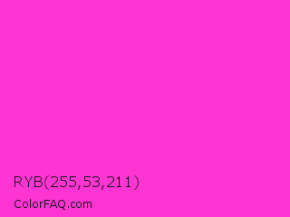 RYB 255,53,211 Color is a normal magenta color and the nearest color is Razzle Dazzle Rose #ff33cc. Hex code #ff35d3 and RGB value is rgb(255,53,211). In RGB color space, this color is composed of 100% red, 21% green, 83% blue, In CMYK color space, this color is composed of 0% cyan, 79% magenta, 17% yellow , 0% black , In HSL color space, this color has a hue angle of 313° , 100% saturation and 60% lightness.
