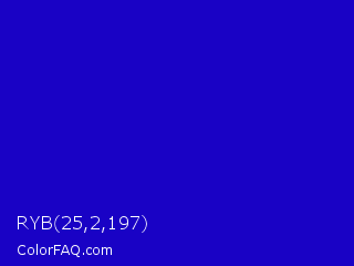 RYB 25,2,197 Color is a normal indigo color and the nearest color is Dark Blue #0000c8. Hex code #1902c5 and RGB value is rgb(25,2,197). In RGB color space, this color is composed of 10% red, 1% green, 77% blue, In CMYK color space, this color is composed of 87% cyan, 99% magenta, 0% yellow , 23% black , In HSL color space, this color has a hue angle of 247° , 98% saturation and 39% lightness.