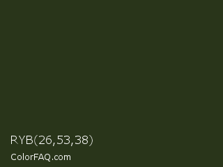 RYB 26,53,38 Color is a very dark green color and the nearest color is Green Kelp #25311c. Hex code #29351a and RGB value is rgb(41,53,26). In RGB color space, this color is composed of 16% red, 21% green, 10% blue, In CMYK color space, this color is composed of 23% cyan, 0% magenta, 51% yellow , 79% black , In HSL color space, this color has a hue angle of 87° , 34% saturation and 15% lightness.