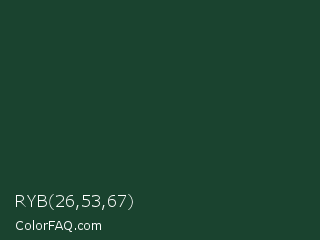 RYB 26,53,67 Color is a very dark green color and the nearest color is Everglade #1c402e. Hex code #1a432f and RGB value is rgb(26,67,47). In RGB color space, this color is composed of 10% red, 26% green, 18% blue, In CMYK color space, this color is composed of 61% cyan, 0% magenta, 30% yellow , 74% black , In HSL color space, this color has a hue angle of 151° , 44% saturation and 18% lightness.