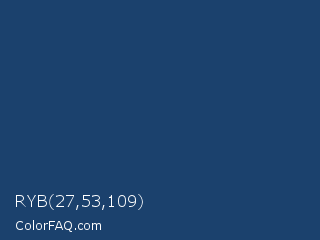 RYB 27,53,109 Color is a dark blue color and the nearest color is Astronaut #283a77. Hex code #1b416d and RGB value is rgb(27,65,109). In RGB color space, this color is composed of 11% red, 25% green, 43% blue, In CMYK color space, this color is composed of 75% cyan, 40% magenta, 0% yellow , 57% black , In HSL color space, this color has a hue angle of 212° , 60% saturation and 27% lightness.