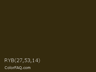 RYB 27,53,14 Color is a very dark orange color and the nearest color is Brown Tumbleweed #37290e. Hex code #352b0e and RGB value is rgb(53,43,14). In RGB color space, this color is composed of 21% red, 17% green, 5% blue, In CMYK color space, this color is composed of 0% cyan, 19% magenta, 74% yellow , 79% black , In HSL color space, this color has a hue angle of 45° , 58% saturation and 13% lightness.