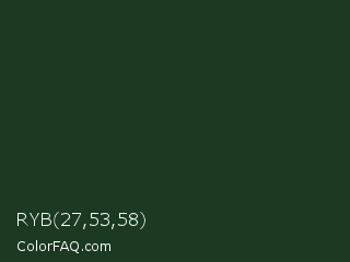RYB 27,53,58 Color is a very dark green color and the nearest color is Celtic #163222. Hex code #1b3a21 and RGB value is rgb(27,58,33). In RGB color space, this color is composed of 11% red, 23% green, 13% blue, In CMYK color space, this color is composed of 53% cyan, 0% magenta, 43% yellow , 77% black , In HSL color space, this color has a hue angle of 132° , 36% saturation and 17% lightness.