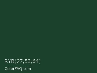 RYB 27,53,64 Color is a very dark green color and the nearest color is Everglade #1c402e. Hex code #1b402b and RGB value is rgb(27,64,43). In RGB color space, this color is composed of 11% red, 25% green, 17% blue, In CMYK color space, this color is composed of 58% cyan, 0% magenta, 33% yellow , 75% black , In HSL color space, this color has a hue angle of 146° , 41% saturation and 18% lightness.