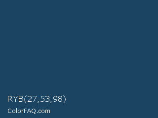 RYB 27,53,98 Color is a dark blue color and the nearest color is Cello #1e385b. Hex code #1b4462 and RGB value is rgb(27,68,98). In RGB color space, this color is composed of 11% red, 27% green, 38% blue, In CMYK color space, this color is composed of 72% cyan, 31% magenta, 0% yellow , 62% black , In HSL color space, this color has a hue angle of 205° , 57% saturation and 25% lightness.